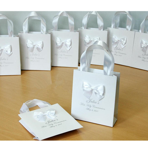 Personalized White Fancy Gift Bags with satin ribbon bow and custom name personalization